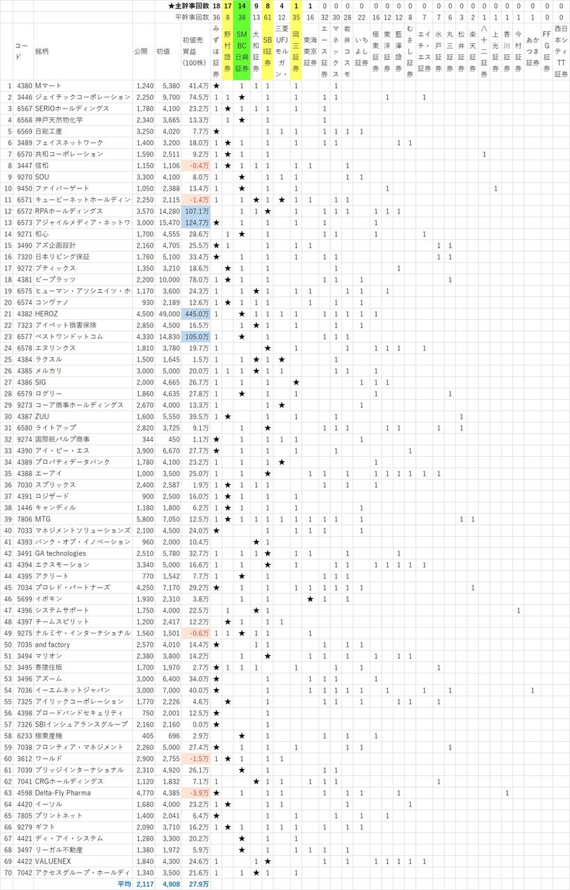 私が参加し始めたMマートから現在まで。そのうち、承認取消や上場中止になったり、リートIPOは除いた全70銘柄のまとめ!