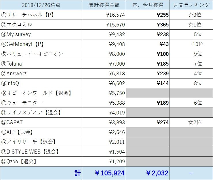 アンケートで毎月いくら稼げているか?今年に入ってからの月集計の一覧です。【P】含む