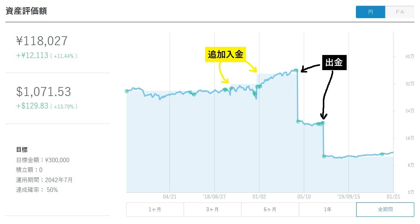 前回記事から持ってきた運用履歴の表↓| 時期 | 出入金 | 評価額 | 手数料 | 分配金 |