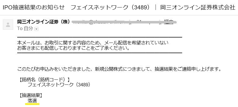 抽選時に買付余力が必要なSBI証券は、抽選対象外となってしまいましたが、抽選時でも資金不要の岡三オンライン証券では抽選に参加することが出来ました