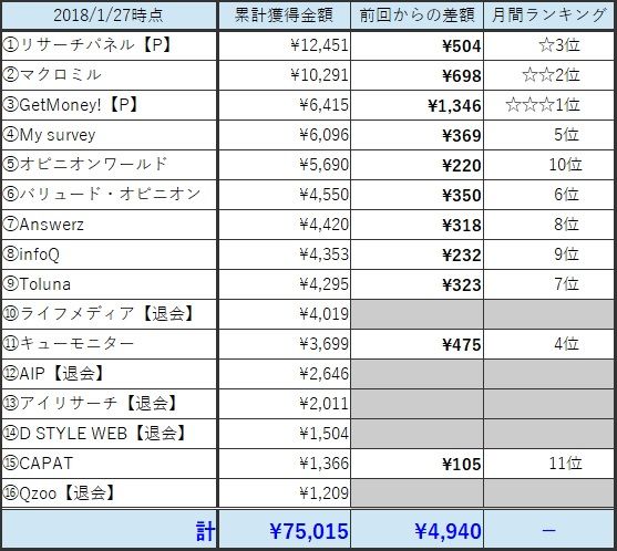 アンケート配信数が少なく、スマホからの回答もしにくいので、私の中では次の退会候補筆頭なのですが、今月は急浮上。ラッキーパンチが当たりました。報酬の大きなアンケートが1つあったのでそれ効果です。